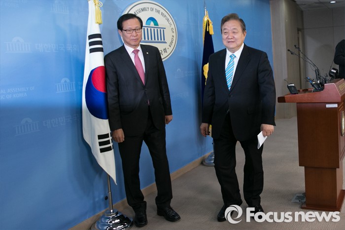 (서울=포커스뉴스) 정대철(오른쪽) 더불어민주당 상임고문이 15일 오전 서울 여의도 국회 정론관에서 탈당 표명 기자회견을 마치고 퇴장하고 있다.