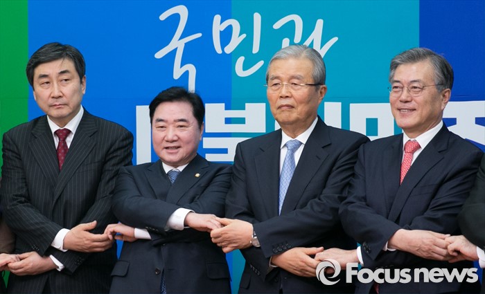 (서울=포커스뉴스) 더불어민주당 조기선대위원장으로 영입된 김종인 전 새누리당 국민행복추진위원장이 15일 오전 서울 여의도 국회에서 기자간담회에 앞서 의원들과 손을 잡고 포즈를 취하고 있다. 왼쪽부터 이종걸 원내대표, 이석현 국회 부의장, 김 위원장, 문재인 대표.