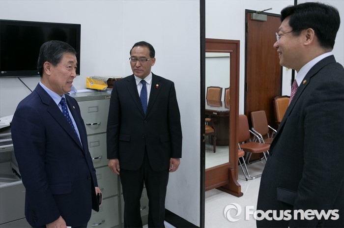 (서울=포커스뉴스) 주형환(오른쪽) 산업통상자원부 장관과 홍윤식(가운데) 행정자치부 장관이 15일 오전 서울 여의도 국회에서 새누리당 지도부를 취임 인사 차 예방, 김무성 대표를 기다리며 황진하 사무총장과 대화하고 있다.