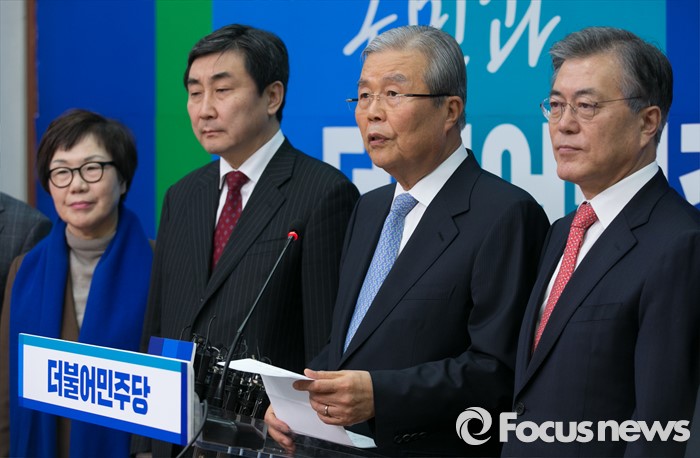 (서울=포커스뉴스) 더불어민주당 조기선대위원장으로 영입된 김종인 전 새누리당 국민행복추진위원장이 15일 오전 서울 여의도 국회에서 기자간담회를 하고 있다. 왼쪽부터 이미경 의원, 이종걸 원내대표, 김 위원장, 문재인 대표.