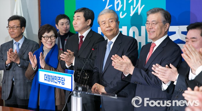 (서울=포커스뉴스) 더불어민주당 조기선대위원장으로 영입된 김종인 전 새누리당 국민행복추진위원장이 15일 오전 서울 여의도 국회에서 기자간담회를 마친 뒤 의원들의 박수를 받고 있다. 왼쪽부터 원혜영, 이미경 의원, 이종걸 원내대표, 김 위원장, 문재인 대표.