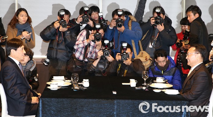 (서울=포커스뉴스) 15일 오후 서울 중구 은행회관에서 유일호(오른쪽) 경제부총리와 이주열 한국은행 총재가 오찬 회동에 앞서 대화를 나누고 있다.