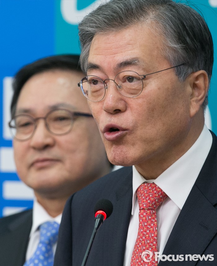 (서울=포커스뉴스) 문재인(오른쪽) 더불어민주당 대표가 15일 오후 서울 여의도 국회에서 열린 유영민 전 포스코 경영연구소 사장 인재영입 기자회견에 참석해 영입에 대한 소감을 전하고 있다.