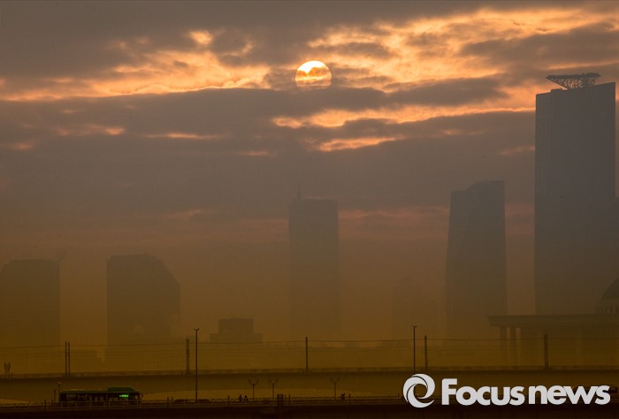 기상청 관계자는 "겨울철 개별 건강관리에 신경써야 한다"고 당부했다.(서울=포커스뉴스) 2016 병신년(丙申年) 첫날인 1일 아침 서울 영등포구 선유도에서 보이는 도심 속 첫 해가 짙은 안개와 구름 사이로 모습을 드러내고 있다. 2016.01.01 김흥구 기자