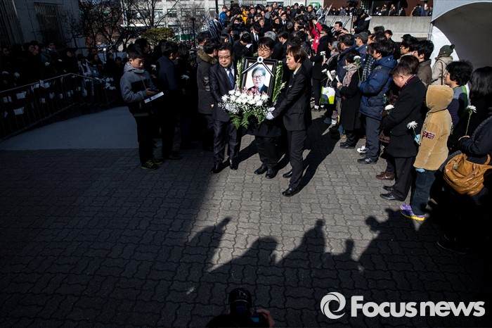 (서울=포커스뉴스) 18일 오후 서울 구로구 성공회대학교에서 엄수된 '故 신영복 석좌교수 영결식'에서 고인의 영정과 유해가 운구되고 있다.