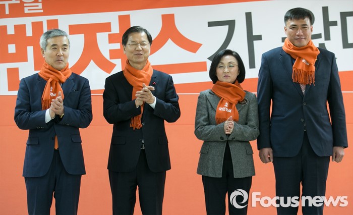 (서울=포커스뉴스) 천정배 국민회의 창당준비위원장이 18일 오후 서울 여의도 당사에서 열린 인재입당식에 참석해 입당인사들에게 당 상징 목도리를 전달한 뒤 박수치고 있다. 왼쪽부터 채수창 전 화순경찰서장, 천 위원장, 장정숙 전 서울시의원, 김영수 전 해군소령.