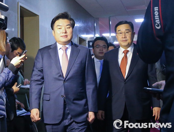 (서울=포커스뉴스) 18일 오후 서울 여의도 국회에서 국회의장 주재로 선거구 획정 및 쟁점 법안 논의를 위해 진행된 여야 원내지도부 회동에 원유철 새누리당 원내대표와 김정훈 정책위의장이 의장 집무실로 향하고 있다. 이날 회동은 여당이 운영위원회 전체회의를 오전에 단독 소집해 '심사기일 지정' 요건(직권상정요건)을 완화하는 내용의 국회법 개정안을 처리한 것에 대해 야당이 반발해 불참했다.