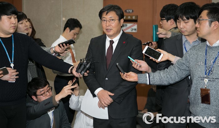 (서울=포커스뉴스) 18일 오후 서울 여의도 국회 정론관에서 운영위원회 야당 간사인 이춘석 더불어민주당 원내수석부대표가 여당이 단독으로 운영위원회 전체회의를 소집해 '심사기일 지정' 요건(직권상정요건)을 완화하는 내용의 국회법 개정안을 처리한 것과 관련 기자회견을 마친 뒤 취재진 질문에 답하고 있다.