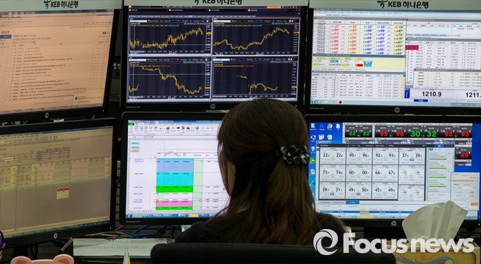 (서울=포커스뉴스) 코스피 지수가 중국 경제에 대한 불안감과 국제유가 하락 등의 여파로 전 거래일 대비 0.42포인트(0.02%) 하락한 1878.45로 마감한 18일 오후 서울 중구 KEB하나은행 딜링룸에서 한 딜러가 외환 상황을 점검 하고 있다. 이날 원달러 환율은 전 거래일보다 1.5원 하락한 1,210.9원, 원위안 환율은 전거래일보다 0.63원 오른 183.93원에 장을 마쳤다.