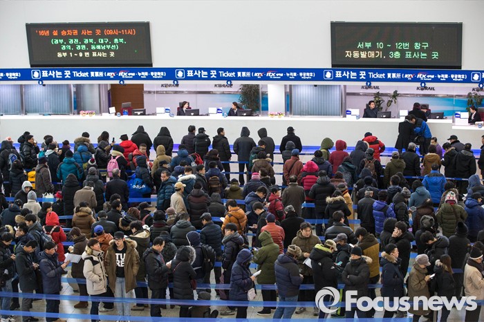 (서울=포커스뉴스) 19일 오전 서울 중구 서울역 매표소 앞에서 시민들이 설 승차권을 구입하기 위해 줄을 서있다.