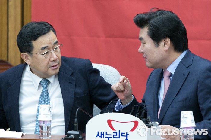 (서울=포커스뉴스) 원유철(오른쪽) 새누리당 원내대표와 김정훈 정책위의장이 19일 오전 서울 여의도 국회에서 열린 원내대책회의에 참석해 대화하고 있다.