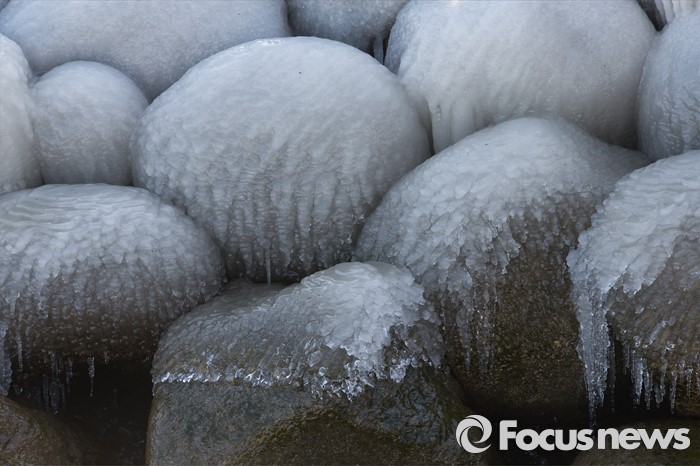 (서울=포커스뉴스) 서울 아침기온이 영하 15도까지 내려간 19일 오전 서울 서초구 반포한강공원 바위에 얼음이 얼어 있다.