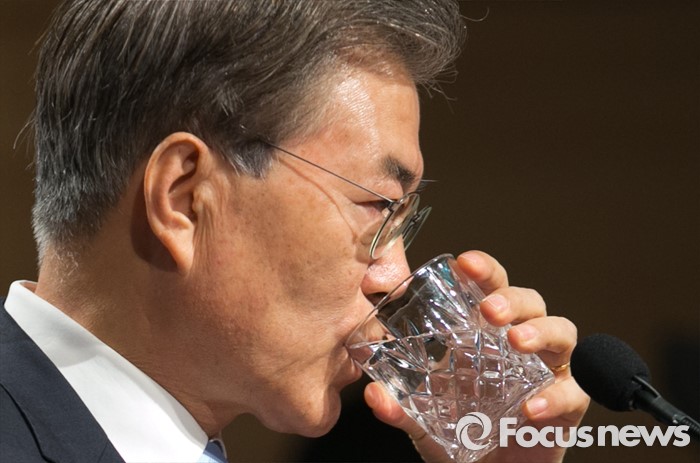 (서울=포커스뉴스) 문재인 더불어민주당 대표가 19일 오전 서울 여의도 국회 의원회관에서 신년 기자회견을 마친 뒤 물을 마시고 있다.