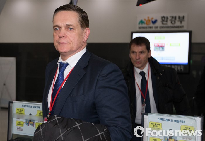 (세종=포커스뉴스) 요하네스 타머 아우디폭스바겐코리아 사장과 프리드리히 요한 아이히러 독일 폭스바겐 파워트레인 총괄책임자 등 독일본사 직원들이 19일 오전 세종시 정부세종청사 환경부 교통환경과에서 결함시정 관련 기술적 내용을 설명하고 환경부를 나서고 있다.