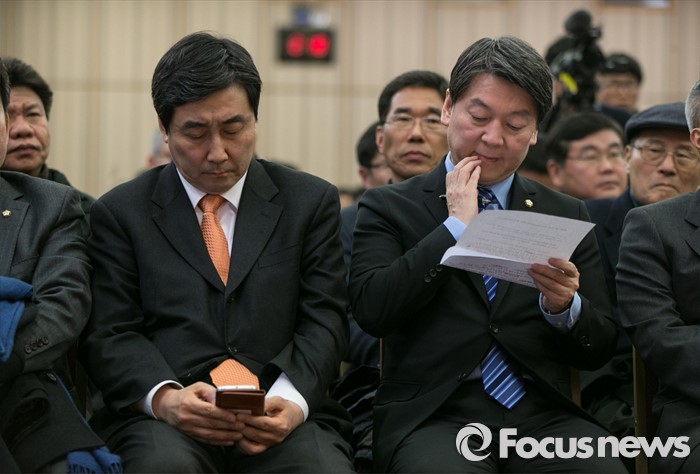 (서울=포커스뉴스) 국민의당(가칭) 안철수 의원(오른쪽)과 더불어민주당 이종걸 원내대표가 19일 오후 서울 중구 은행회관 국제회의실에서 열린 금융노조 제51차 정기전국대의원대회에 참석해 나란히 앉아 있다.
