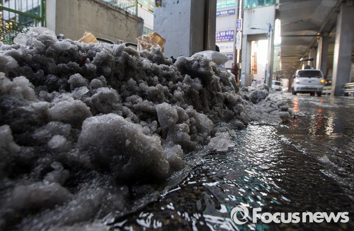 (서울=포커스뉴스) 19일 오후 서울 광진구 동부지방법원 앞 상수관이 노후로 파열돼 인근 도로가 결빙돼 있다.