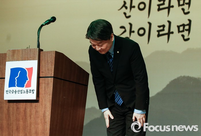 (서울=포커스뉴스) 국민의당 안철수 의원이 19일 오후 서울 중구 은행회관 국제회의실에서 열린 금융노조 제51차 정기전국대의원대회에 참석해 축사에 앞서 인사를 하고 있다.
