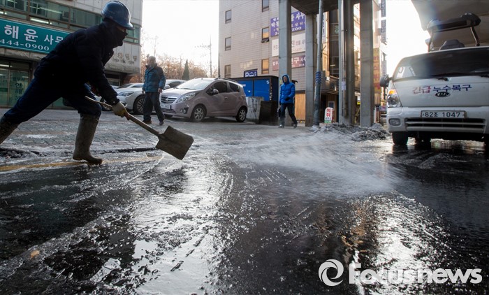 (서울=포커스뉴스) 19일 오후 서울 광진구 동부지방법원 앞 상수관이 노후로 파열돼 인근 도로가 결빙돼 있다.