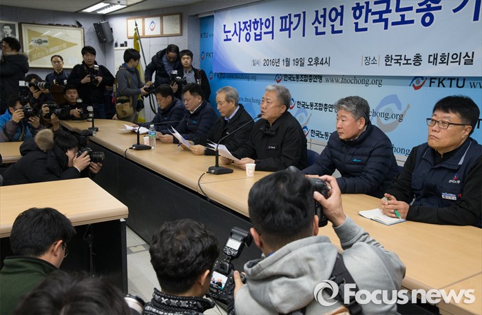 (서울=포커스뉴스) 김동만 한국노총 위원장이 19일 오후 서울 영등포구 한국노동조합총연맹에서 열린 노사정합의 파기 선언 한국노총 기자회견에 선언을 끝낸 뒤 취재진의 질문에 대답을 하고 있다.