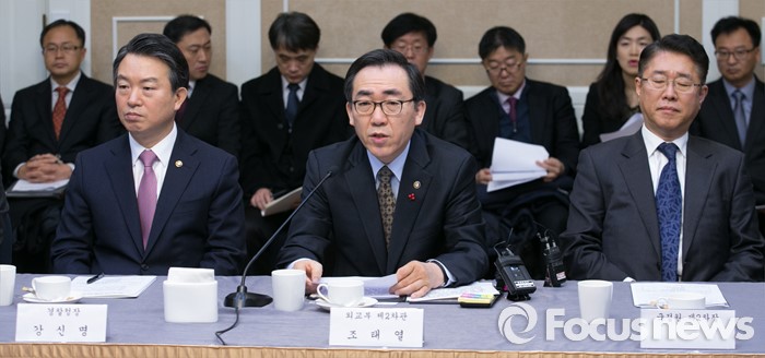 (서울=포커스뉴스) 20일 오전 서울 여의도 국회 귀빈식당에서 열린 테러 위기상황 대처를 위한 합동 당정협의에 참석한 조태열 외교부 2차관이 발언하고 있다. 왼쪽부터 강신명 경찰청장, 조 2차관, 김수민 국가정보원 2차장.