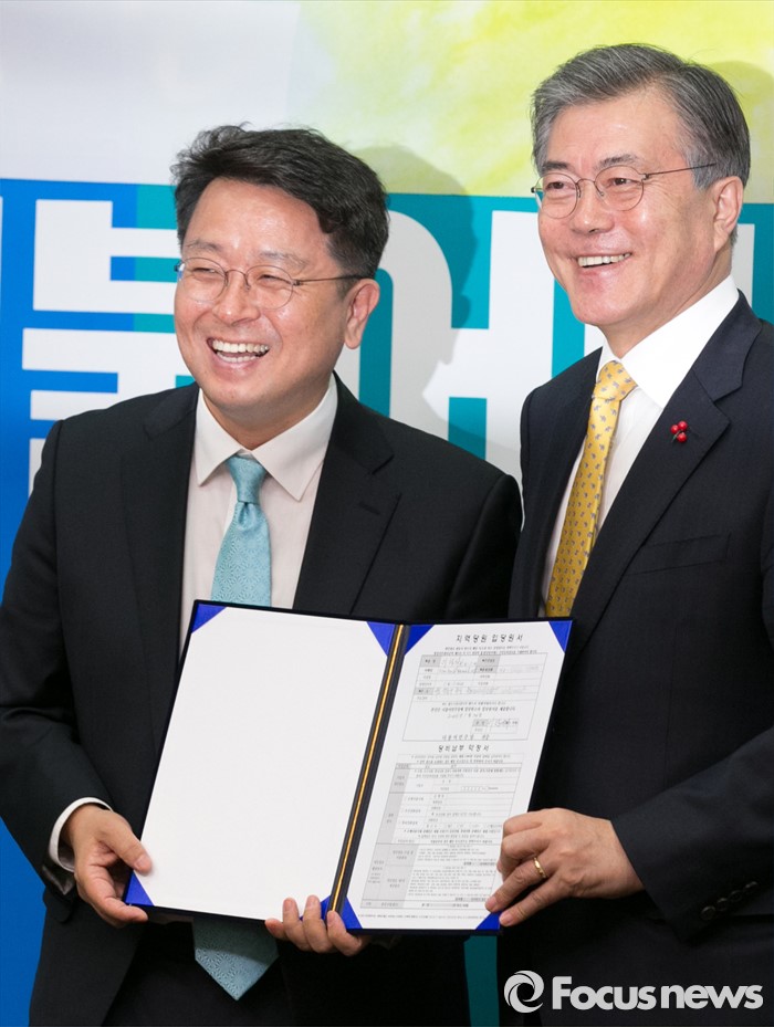 (서울=포커스뉴스) 문재인 대표와 이철희 두문정치연구소 소장이20일 오전 서울 여의도 국회 더불어민주당 대표실에서 열린 입당 기자회견에 참석해 기념사진을 찍고 있다.