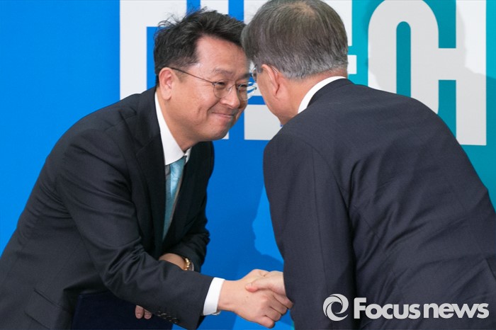 (서울=포커스뉴스) 이철희(왼쪽) 두문정치연구소 소장이 20일 오전 서울 여의도 국회 더불어민주당 대표실에서 열린 입당 기자회견에 참석해 문재인 대표와 악수하고 있다.