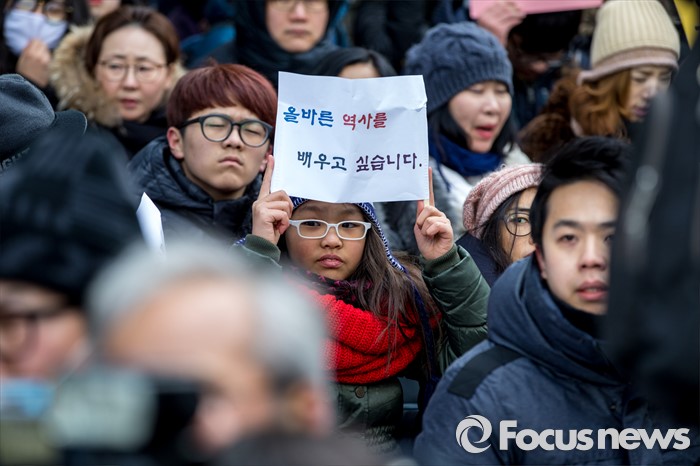 (서울=포커스뉴스) 20일 오후 서울 종로구 옛 일본대사관 앞에서 열린 제1214차 일본군 위안부 문제 해결 위한 정기수요시위에서 참가자들이 한일 위안부 합의 무효를 촉구 하고 있다. 이날 일본군 위안부 피해자 할머니들은 연이은 혹한으로 시위에 자리하지 못했다.