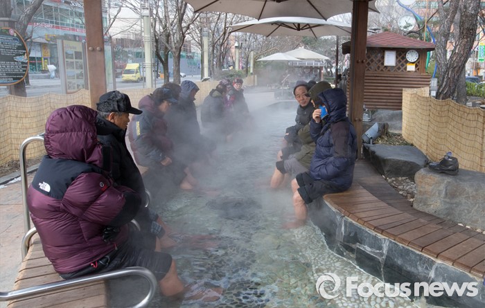 (대전=포커스뉴스) 절기상 대한인 21일 오전 대전 유성구 족욕체험장에서 영하의 강추위에도 불구하고 시민들이 온천수에 발을 담그고 몸을 녹이고 있다.