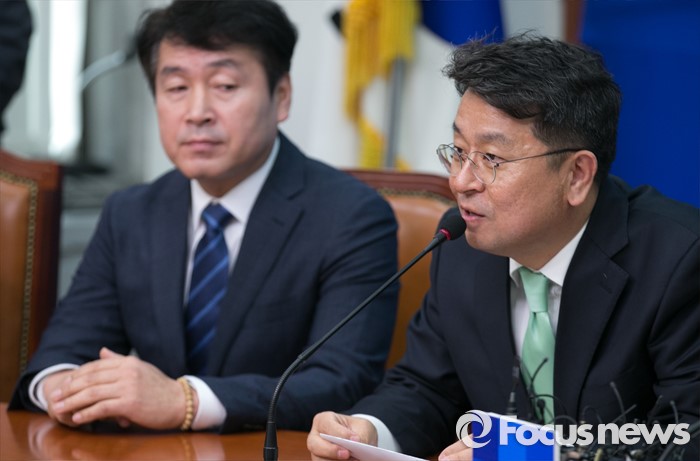 (서울=포커스뉴스) 21일 오전 서울 여의도 국회에서 열린 더불어민주당 뉴파티특별위원회 출범 회의에 참석한 이철희 두문정치전략연구소장이 인사말을 하고 있다.
