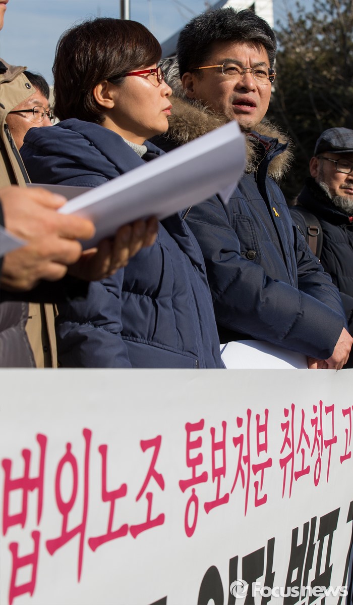 (서울=포커스뉴스) 21일 오후 서울 서초구 서울중앙지방법원 인근에서 열린 법외노조 통보처분 취소청구 고법 판결에 대한 전교조 입장 발표 기자회견에서 변성호 전국교직원노동조합 위원장이 입장을 밝히고 있다.