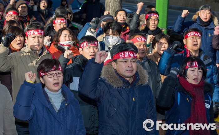 (서울=포커스뉴스) 21일 오후 서울 서초구 서울중앙지방법원 인근에서 열린 전교조 탄압 분쇄 결의대회에서 변성호 전국교직원노동조합 위원장 및 참가자들이 구호를 외치고 있다.