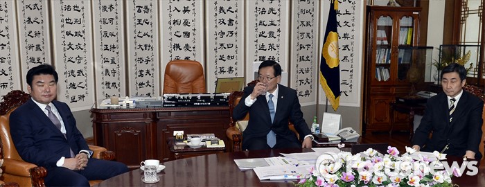 (서울=포커스뉴스) 정의화(가운데) 국회의장과 원유철(왼쪽) 새누리당 원내대표, 이종걸 더불어민주당 원내대표가 21일 오후 서울 여의도 국회 의장집무실에서 선거구 획정 및 국회법 개정안 등 쟁점 법안 처리를 위한 현안 논의를 하고 있다.