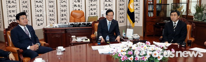 (서울=포커스뉴스) 정의화(가운데) 국회의장과 원유철(왼쪽) 새누리당 원내대표, 이종걸 더불어민주당 원내대표가 21일 오후 서울 여의도 국회 의장집무실에서 선거구 획정 및 국회법 개정안 등 쟁점 법안 처리를 위한 현안 논의를 하고 있다.