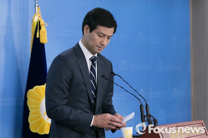 (서울=포커스뉴스) 문대성 새누리당 의원이 22일 오전 서울 여의도 국회 정론관에서 20대 총선 불출마 선언 철회를 발표한 뒤, 단상을 내려오고 있다.