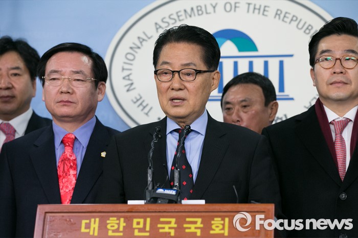 (서울=포커스뉴스) 박지원(가운데) 더불어민주당 의원이 22일 오전 서울 여의도 국회 정론관에서 탈당을 표명하는 기자회견을 하고 있다.