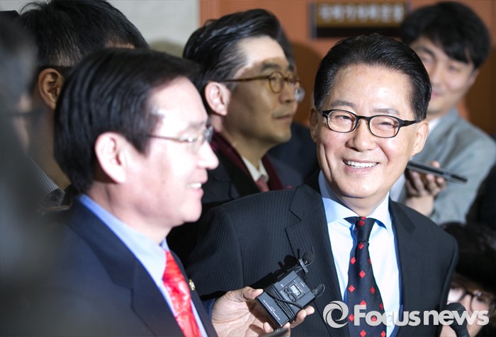 (서울=포커스뉴스) 박지원 더불어민주당 의원이 22일 오전 서울 여의도 국회 정론관에서 탈당 기자회견을 마친 뒤 취재진 질문에 답하던 중 미소 짓고 있다.