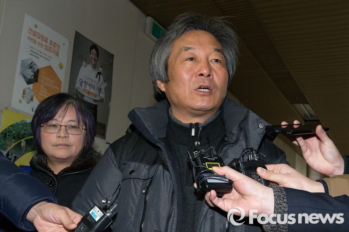 (서울=포커스뉴스) 박래군 4·16연대 상임운영위원과 김혜진 운영위원이 22일 오전 서울 서초구 서울중앙지방법원에서 열린 선고 공판을 마친 뒤 취재진의 질문에 답하고 있다.