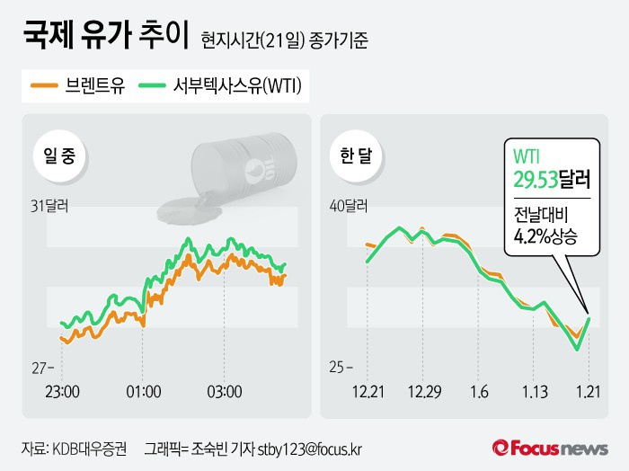 (서울=포커스뉴스) 21일 뉴욕상업거래소(NYMEX)에서 서부텍사스산 원유(WTI) 3월 인도분 가격은 전날 대비 1.18달러(4.2%) 오른 배럴당 29.53달러로 마감했다. 4.2% 상승은 지난해 10월 이후 최고 수준이다.