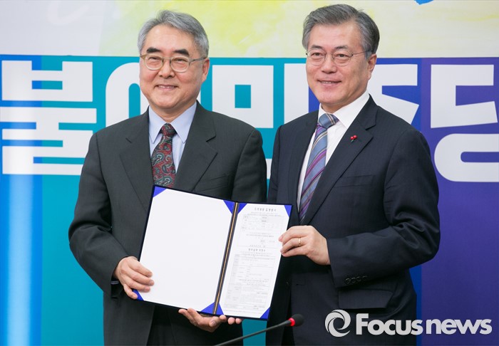 (서울=포커스뉴스) 문재인(오른쪽) 더불어민주당 대표가 22일 오후 서울 여의도 국회에서 열린 인재영입 기자회견에 참석해 박근혜 대선 캠프 출신인 양봉민 서울대 보건학과 교수로부터 입당원서를 전달받은 뒤 포즈를 취하고 있다. 양 교수는 지난 18대 대선에서 새누리당이 경제민주화를 위해 구성한 국민행복추진위원회에 참여했던 인물이며, 박 대통령의 보건복지 공약을 만든 '편안한 삶 추진단'의 보건의료팀장을 맡았었다.
