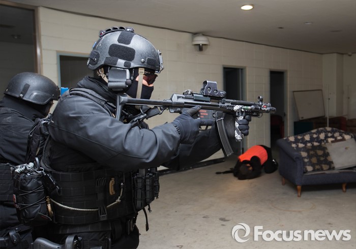 (서울=포커스뉴스) 22일 오후 서울 경찰특공대 훈련장에서 테러상황에 대비한 경찰, 소방, 군 전력이 함께 한 합동훈련이 실시된 가운데 경찰특공대 대원들이 테러범에 의한 인질상항 등을 가정한 훈련을 진행하고 있다.