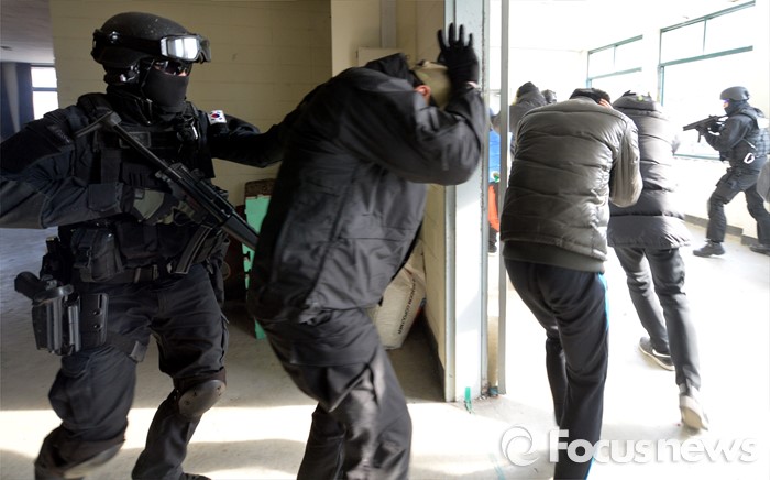 (서울=포커스뉴스) 김신조 청와대 침투사건인 ‘1·21사태’ 48주년을 맞아 서울경찰청·소방재난본부·수도방위사령부가 합동으로 수도 서울을 지키기 위한 테러 진압 훈련을 실시한 22일 서울 서초구 경찰특공대 훈련장에서 군 테러 진압 부대와 경찰특공대 대원들이 인질범 진압 작전을 펼치고 있다.