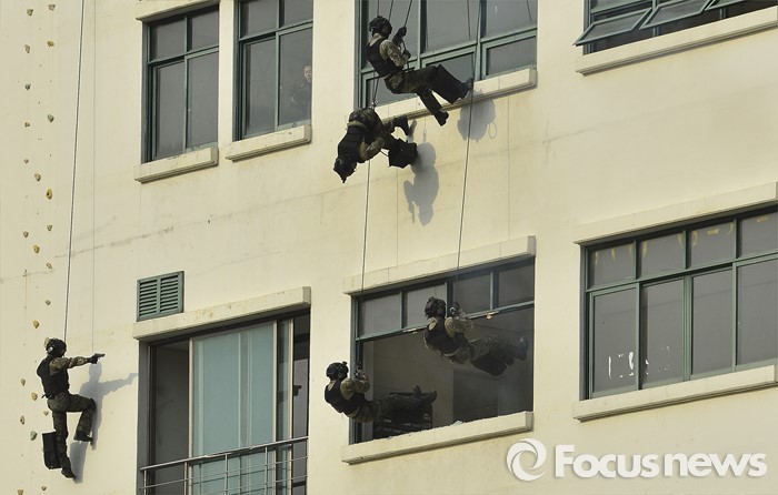 (서울=포커스뉴스) 22일 오후 서울 서초구 서울경찰특공대 훈련장에서 열린 경찰·군·소방 대테러 합동훈련에서 특공대원들이 인질범 제압 훈련을 하고 있다.