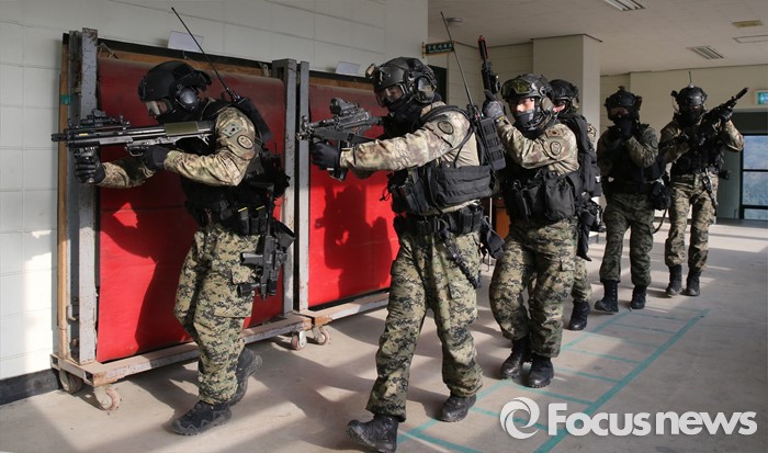 (서울=포커스뉴스) 김신조 청와대 침투사건인 ‘1·21사태’ 48주년을 맞아 서울경찰청·소방재난본부·수도방위사령부가 합동으로 수도 서울을 지키기 위한 테러 진압 훈련을 실시한 22일 서울 서초구 경찰특공대 훈련장에서 군 테러 진압 부대가 인질범 진압 작전을 펼치고 있다.