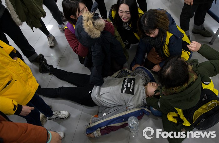 (서울=포커스뉴스) 22일 오후 서울 중구 서울고용노동청을 민원실을 점거한 알바노조원들이 경찰과 충돌, 한 노조원이 정신을 잃고 쓰러져고 있다. 알바노조 조합원 100여명은 근로감독관 일처리 개선을 촉구하며 노동청을 기습 점거했다.