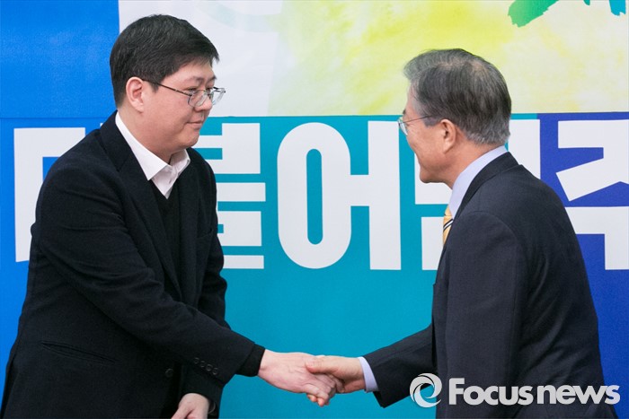 (서울=포커스뉴스) 김대중 전 대통령의 삼남 김홍걸(왼쪽) 연세대 김대중 도서관 객원교수가 24일 오전 서울 여의도 국회 더불어민주당 당대표실에서 입당 기자회견을 마치고 문재인 대표와 악수하고 있다.