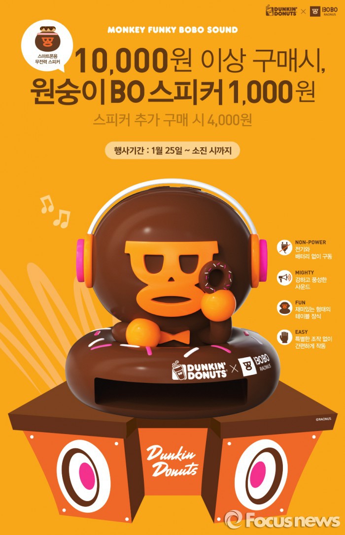 (서울=포커스뉴스) 던킨도너츠는 원숭이의 해를 기념해 25일부터 던킨도너츠 제품을 만원 이상 구매하면 스마트폰 용 ‘몽키펑키 BOBO 사운드’ 스피커를 1000원에 판매하는 프로모션을 진행한다.