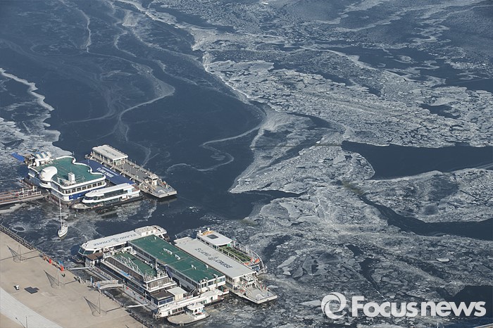 (서울=포커스뉴스) 연일 강추위가 계속되고 있는 25일 오전 서울 영등포구 63빌딩에서 바라본 한강 일대가 얼어붙어 있다.