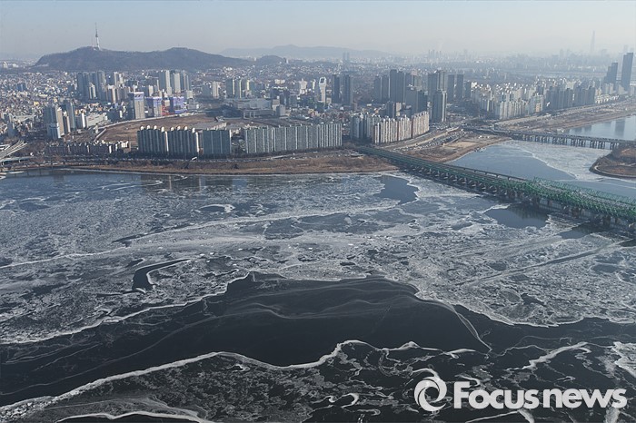 (서울=포커스뉴스) 연일 강추위가 계속되고 있는 25일 오전 서울 영등포구 63빌딩에서 바라본 한강 일대가 얼어붙어 있다.