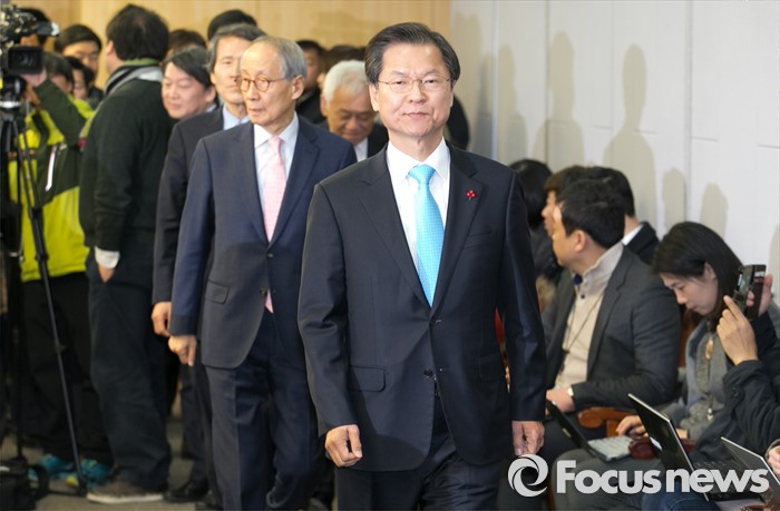 (서울=포커스뉴스) 25일 오전 서울 여의도 국회 의원회관에서 열린 국민의당-국민회의 통합발표 기자회견에 천정배(오른쪽부터) 국민회의 창당준비위원장, 김한길 국민의당 상임부위원장, 윤여준, 한상진 공동창당준비위원장, 안철수 인재영입위원장이 참석하고 있다.