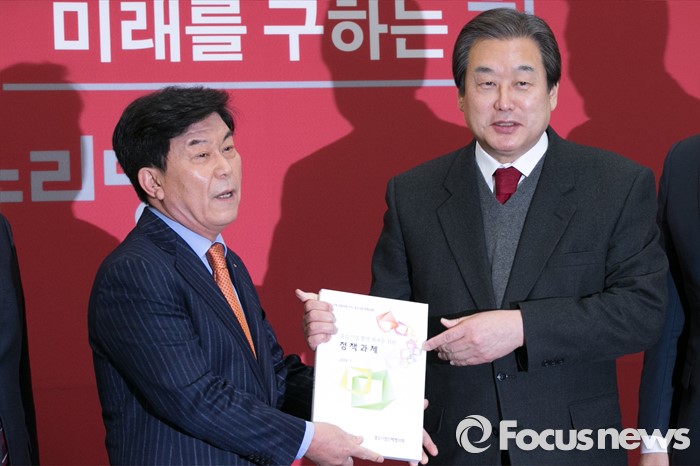 (서울=포커스뉴스) 김무성(오른쪽) 새누리당 대표가 25일 오전 서울 여의도 국회 대표최고위원실에서 박성택 중소기업중앙회 회장으로부터 '20대 총선 중소기업 정책공약 건의서'를 전달받고 있다.